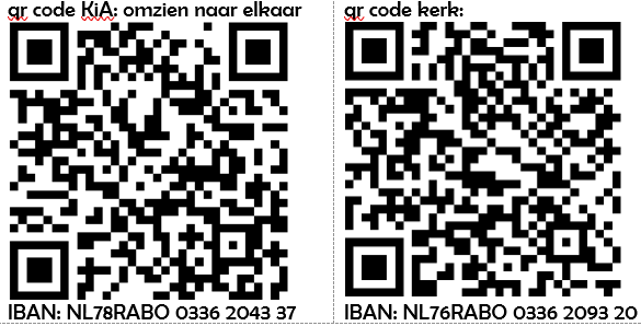 Amen amen amen Orgelspel: Evang. liedbundel 413 Lichtstad met uw paarlen poorten Collecte 21 november Kerk in Actie – Omzien naar elkaar In het pastoraat draait het om nabijheid. En juist dat was lastig in coronatijd. Nieuwe vormen van liefdevolle aandacht werden bedacht. Het pastorale werk deed er meer dan ooit toe. In Nederland werken er zo’n 500 geestelijk verzorgers vanuit de Protestantse Kerk in het pastoraat buiten de plaatselijke gemeenten, in onder meer de zorg, de scheepvaart, de krijgsmacht en de luchthaven. Daar maken zij de kerk zichtbaar. Ook veel gemeenteleden hebben daarin als vrijwilliger een rol. Om hen toe te rusten in hun pastorale taken ontwikkelt de Protestantse Kerk trainingen en materialen, zoals 'De kleine gids voor onderling pastoraat’. Ook voor kerkenraden en predikanten verschijnt er materiaal, zoals de handreiking ‘Mens tot het einde’, over de begeleiding van mensen met dementie, hun naasten en hun zorgverleners. Met uw bijdrage aan de collecte steunt u de Protestantse Kerk in het ontwikkelen van pastorale trainingen en toerustingsmaterialen. U kunt u gift overmaken via de QR code hieronder of op bankrekeningnummer NL78RABO 0336 2043 37 o.v.v. Kerk in actie – omzien naar elkaar. Doet u mee? Van harte aanbevolen. | ||||||||||||||