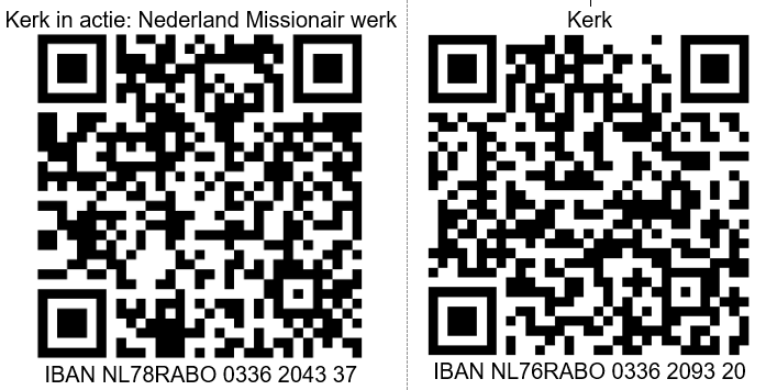 Met uw bijdrage aan de collecte ondersteunt de Protestantse Kerk het missionaire activiteiten in het hele land. Geef via QR code of maak een bijdrage over op NL78RABO 0336 2043 37 t.n.v. Protestantse Kerk De Lier o.v.v. Missionair Werk.