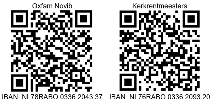 Uw kunt uw gift overmaken via QR code of op NL78RABO 0336 2043 37 t.n.v. diaconie PG De Lier o.v.v. Oxfam Novib