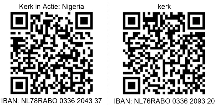 Geef aan de collecte in de kerk Of maak uw bijdrage over via de QR code of op NL78RABO 0336 2043 37 t.n.v. PG De Lier o.v.v. Kerk in Actie Nigeria. Kijk voor meer informatie op: www.kerkinactie.nl/vluchtelingen-nigeria.