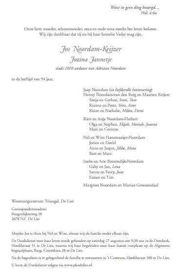 Zaterdag 27 augustus 2022 om 09.30 uurUitvaart Jozina Jannetje (Jos) Noordam-KeijzerVoorganger(s): ds. Lennart van Berkel Organist: Wim Loef Beamer: Cees Vermeer |