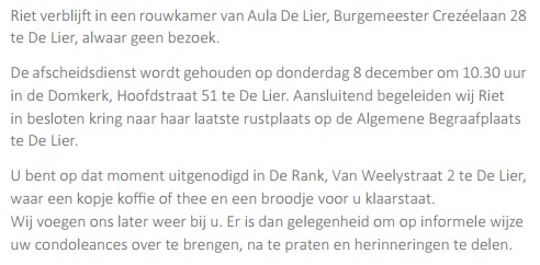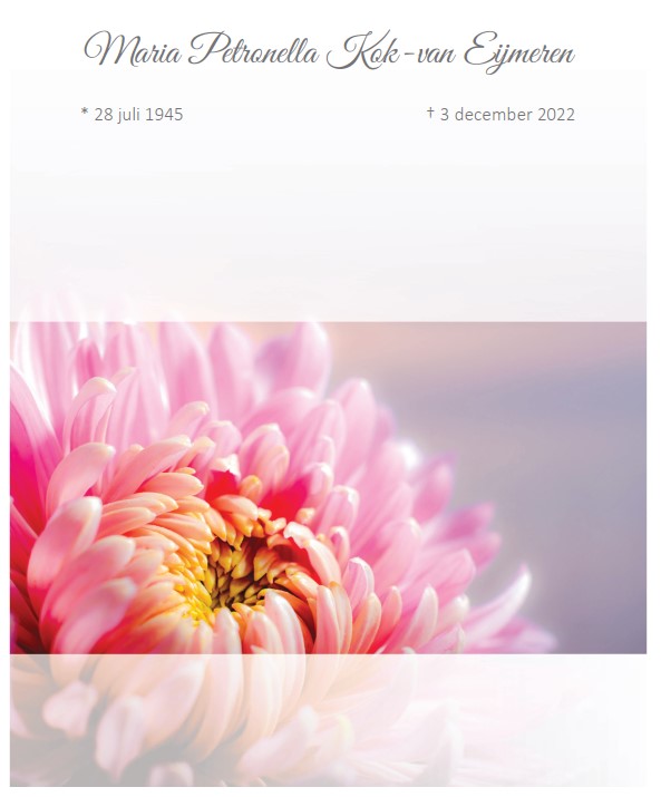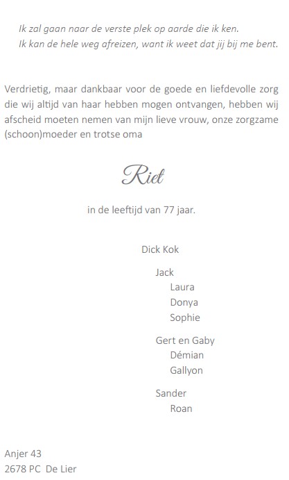 Zaterdagavond, 3 december, is overleden: Riet Kok – van Eijmeren. We wisten dat ze niet meer beter kon, maar het ging wel onverwachts snel. Ze was 4 weken in Hospice Beukenrode in Naaldwijk. Riet woonde met echtgenoot Dick aan de Anjer 43. Ze laat haar man en drie zonen na, schoondochters, kleinkinderen. Ze was 77 jaar. We wensen en bidden haar man en gezin, die haar erg zullen missen, troost en zegen toe, van God en mensen, en ook allen, familie, die haar zullen missen