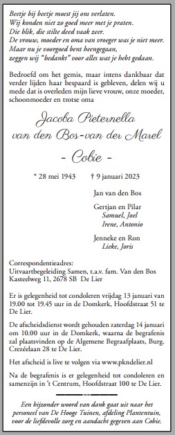 Zaterdag 14 januari 2023 om 10.00 uurAfscheidsdienst Cobie van den Bos - van der MarelVoorganger(s): ds. Lennart van Berkel Beamer: Paul Mosterd |