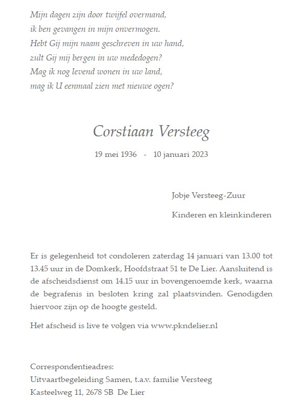 Zaterdag 14 januari 2023 om 14.15 uurAfscheidsdienst Corstiaan VersteegVoorganger(s): ds. Gerard van Velzen Organist: Wim Loef Beamer: Cees Vermeer |