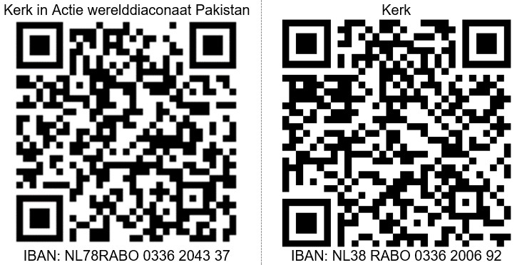 Met de opbrengst van deze collecte steunt u het werk van Kerk in Actie in Pakistan. Helpt u mee? Geef in de collecte of maak uw gift via de QR code over of NL78RABO 0336 2043 37 t.n.v. PG De Lier o.v.v. Werelddiaconaat werkgelegenheid Pakistan.