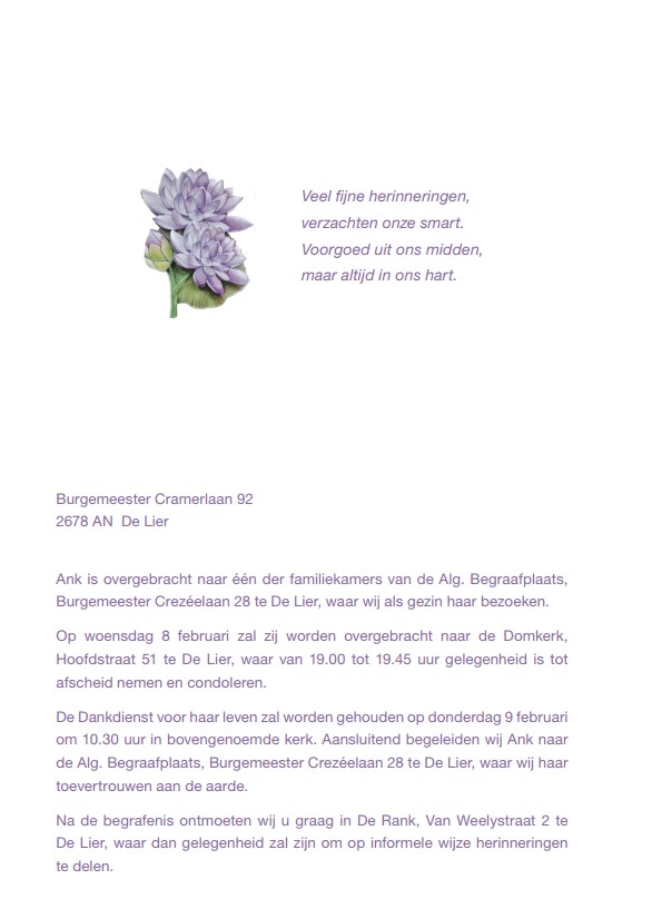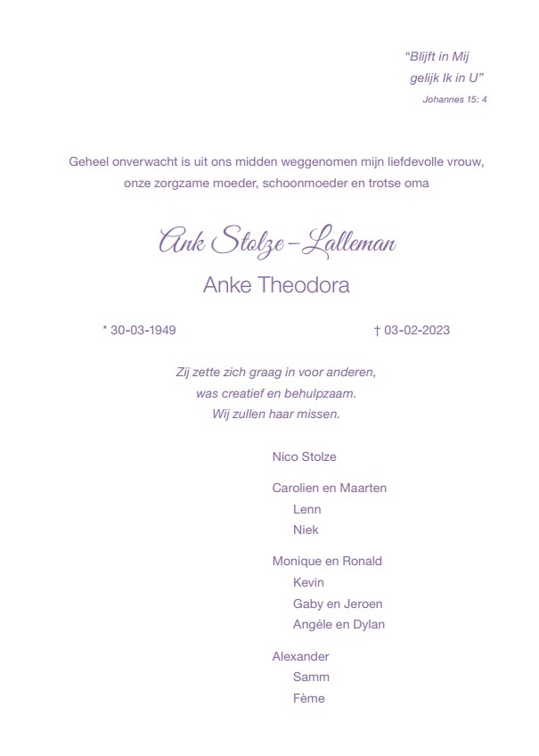 Vrijdagavond 3 februari is overleden, mw. Ank Stolze-Lalleman, in de leeftijd van 73 jaar. Ank overleed aan de complicaties van een zwaar hartinfarct vorige week zaterdag. Het is heel onwerkelijk voor echtgenoot Nico, de kinderen en kleinkinderen en velen die in Ank een geliefd mens verliezen. A.s. donderdag 9 februari is er om 10.30 uur in de Domkerk de dankdienst voor haar leven en aansluitend zal de begrafenisplaats vinden.