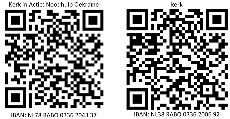 Geef in de collecte, via de QR code of maak uw bijdrage over via NL78RABO 0336 2043 37 t.n.v. PG De Lier o.v.v. ‘Kerk voor de samenleving in Oekraïne’.