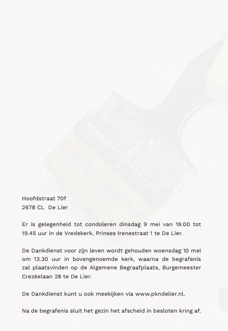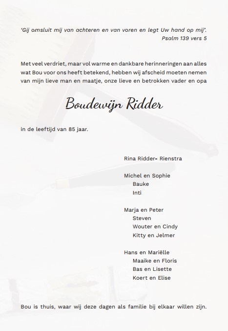 Woensdag 10 mei 2023 om 13.30 uurDankdienst Bou RidderVoorganger(s): ds. Lennart van Berkel Ouderling(en): Rien van Dam Organist: Leo Bouma Beamer: Paul Mosterd |