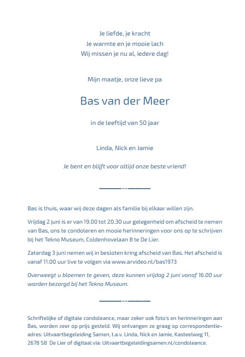 Schriftelijke of digitale condoleances, maar zeker ook foto’s en herinneringen aan Bas, worden zeer op prijs gesteld. Het gezin ontvangt ze graag op het correspondentieadres: