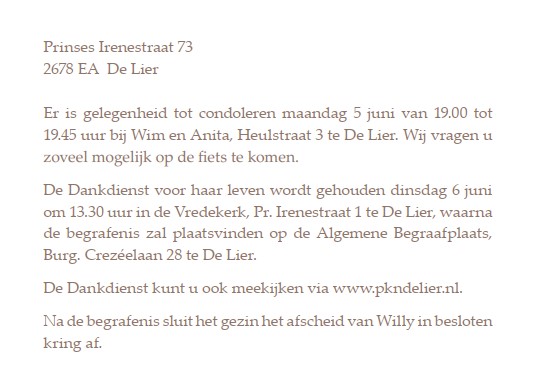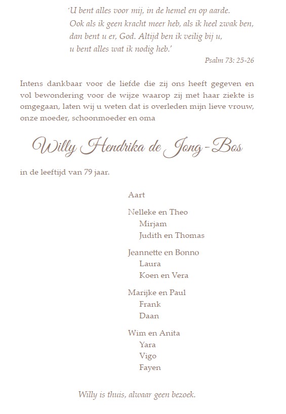 Dinsdag 6 juni 2023 om 13.30 uurDankdienst mw. Willy de Jong-BosVoorganger(s): Gertjan Pellikaan Organist: Jobje Versteeg-Zuur Beamer: Paul Mosterd |