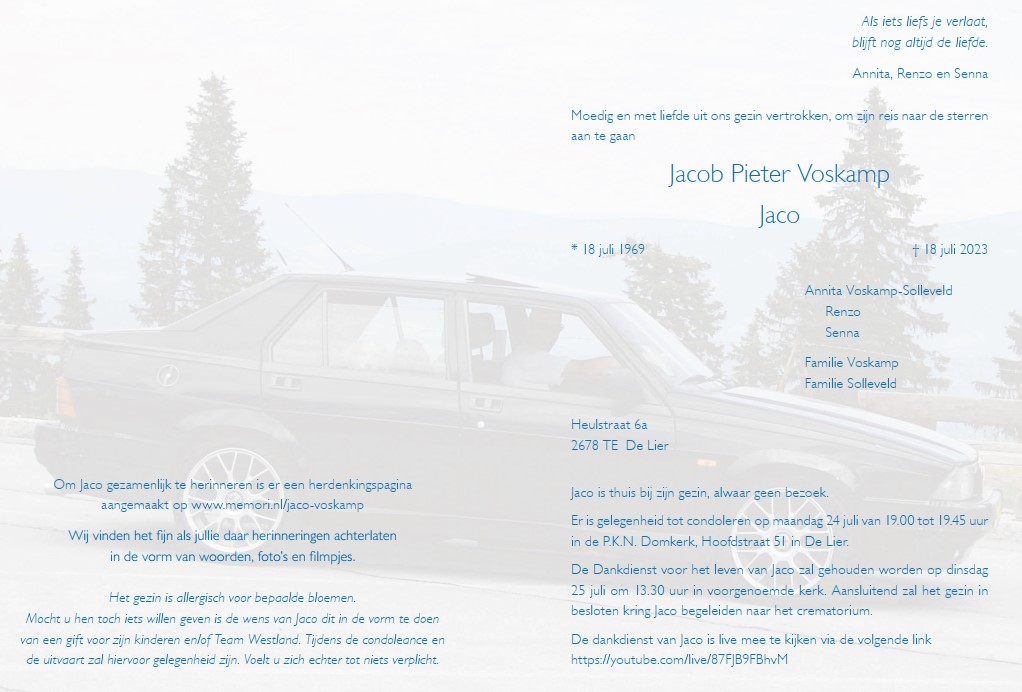 Vanuit wijk 2 het trieste bericht dat op 18 juli is overleden, in de leeftijd van 54 jaar, de heer Jacob Pieter (Jaco) Voskamp. Hij heeft ruim een jaar een dappere strijd gestreden...
