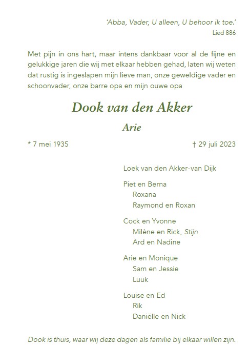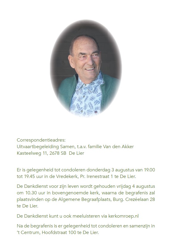 Vrijdag 4 augustus 2023 om 10.30 uurDankdienst Dook van den AkkerVoorganger(s): ds. Lennart van Berkel Ouderling(en): Arjen van Duijn Organist: Frank Baggerman Streamer: Marco Stolze In tegenstelling van voorgaande berichten, wordt deze dienst wel uitgezonden via de stream!Meekijken? Dit kan door te klikken op dit logo:![]() Wilt u meeluisteren? Klik op het oortje voor de Vredekerk: ![]()