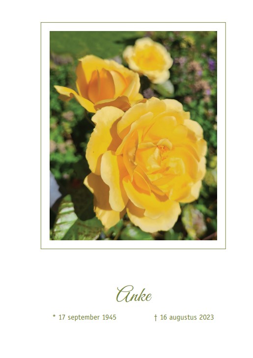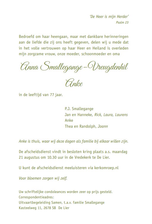 Maandag 21 augustus 2023 om 10.30 uurAfscheidsdienst Anke Smallegange- VreugdenhilVoorganger(s): Gertjan Pellikaan Organist: Frank Baggerman Locatie: Vredekerk |