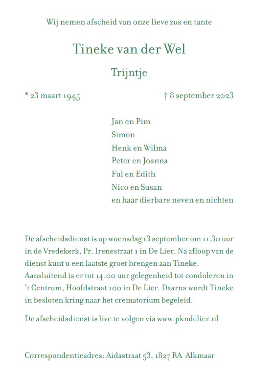 Een verhaal over Tinekes levensloop met twee toegiften Lied 925: Wek mijn zachtheid weer (Tinekes neef Jaap zingt voor, gemeente herhaalt 2 keer) Wek mijn zachtheid weer. Geef mij terug de ogen van een kind. Dat ik zie wat is. En mij toevertrouw. En het licht niet schuw. Lezen Psalm 121 (uit het getijdenboekje van Tineke) Ik hef mijn ogen op naar de bergen: Vanwaar zal mijn hulp komen? Mijn hulp is van de Heilige, die hemel en aarde gemaakt heeft. De Heilige zal niet toelaten, dat mijn voet wankelt, mijn Bewaarder zal niet sluimeren. Zie, de Bewaarder van Israël sluimert noch slaapt. De Heilige is mijn Bewaarder, de Heilige is de schaduw aan mijn rechterhand. De zon zal mij overdag niet steken, noch de maan ’s nachts. De Heilige zal mij bewaren voor alle kwaad, de Heilige zal mijn ziel bewaren. De Heilige zal mijn uitgang en mijn ingang bewaren van nu aan tot in eeuwigheid. Lied 607: 1 + 2 + 3 1. Gij zijt voorbijgegaan, een steekvlam in de nacht. De vonken van uw naam, zijn ogen in ons hart. In flarden hangt uw woord, om onze wereld heen, wij leven in U voort, wij zijn met U bekleed. 2. Gij zijt voorbijgegaan, een voetspoor in de zee. Gij zijt te ver gegaan, Gij zijt een mens te veel. Gij zijt voorgoed, Gij zijt verborgen in uw God. Geen stilte spreekt U uit, ondenkbaar is uw dood. 3. Gij zijt voorbijgegaan, een vreemd bekend gezicht, een stuk van ons bestaan, een vriend, een spoor van licht. Uw licht is in mijn bloed, mijn lichaam is uw dag, ik hoop U tegemoet, zolang ik leven mag. Lezen uit de Bijbel: Lucas 1: 46 - 55 Maria zei: Mijn ziel prijst en looft de Heer, mijn hart juicht om God, mijn redder: Hij heeft oog gehad voor mij, zijn minste dienares. Alle geslachten zullen mij voortaan gelukkig prijzen, ja, grote dingen heeft de Machtige voor mij gedaan, heilig is zijn naam, Barmhartig is Hij, van geslacht op geslacht, voor al wie hem vereert. Hij toont zijn macht en de kracht van zijn arm en drijft uiteen wie zich verheven wanen, heersers stoot hij van hun troon en wie gering is, geeft Hij aanzien. Wie honger heeft overlaadt hij met gaven, maar rijken stuurt hij weg met lege handen. Hij trekt zich het lot aan van Israël zijn dienaar, zoals Hij aan onze voorouders heeft beloofd: Hij herinnert zich zijn barmhartigheid jegens Abraham en zijn nageslacht, tot in eeuwigheid. Lied 157a: 1 1. Mijn ziel maakt groot de Heer, mijn geest verheugt zich zeer, want God heeft mij, geringe, die Hem als dienstmaagd dien, goedgunstig aangezien; en deed mij grote dingen. Overweging Psalm 139: 2 2. Gij zijt zo diep vertrouwd met mij: wie weet mijn wegen zoals Gij? Gij kent mijn leven woord voor woord, Gij hebt mij voor ik spreek gehoord. Ja overal, op al mijn wegen en altijd weer komt Gij mij tegen. Gebeden Onze Vader Onze Vader die in de hemelen zijt, Uw naam worde geheiligd; Uw koninkrijk kome; Uw wil geschiede, op aarde zoals in de hemel. Geef ons heden ons dagelijks brood; en vergeef ons onze schulden; zoals ook wij onze schuldenaars vergeven. En leid ons niet in verzoeking, maar verlos ons van het Kwaad. Want van u is het koninkrijk en de kracht en de heerlijkheid, tot in eeuwigheid. Amen. Woord van uitgeleide Lied 527: 1 + 2 + 5 1. Uit uw hemel zonder grenzen komt Gij tastend aan het licht, met een naam en een gezicht, even weerloos als wij mensen. 2. Als een kind zijt Gij gekomen, als een schaduw die verblindt, onnaspeurbaar als de wind die voorbijgaat in de bomen. 3. Als een woord zijt Gij gegeven Als een nacht van hoop en vrees Als een pijn die ons geneest Als een nieuw begin van leven. Zegen Amen Na afloop van de dienst kunt u een laatste groet brengen aan Tineke Muziek: Franz Schubert, de langzame delen uit de beide pianotrio’s | ||