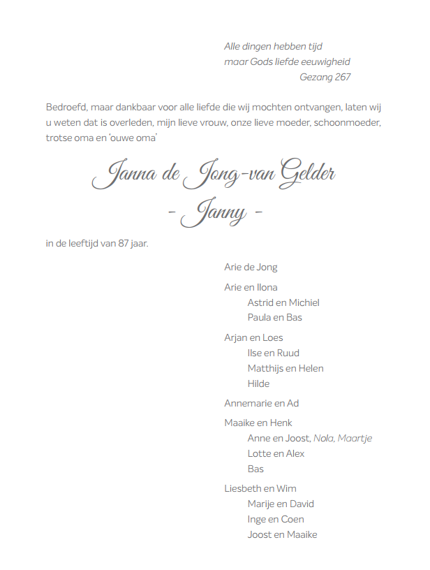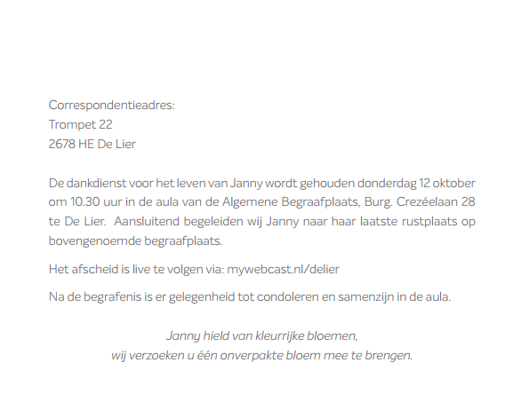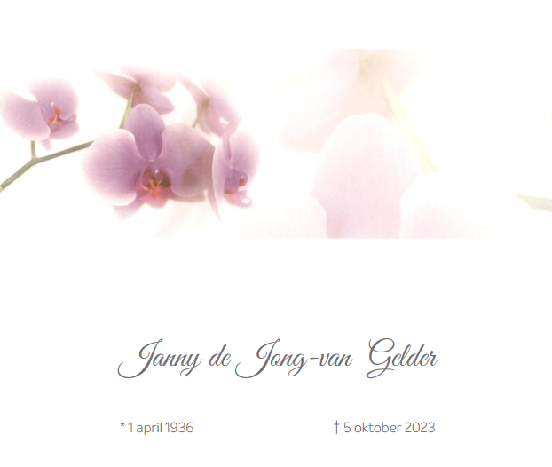 Donderdag 12 oktober 2023 om 10.30 uurDankdienst Janny de Jong-van GelderVoorganger(s): ds. Lennart van Berkel Organist: Jobje Versteeg-Zuur Locatie: Aula van de begraafplaats. |