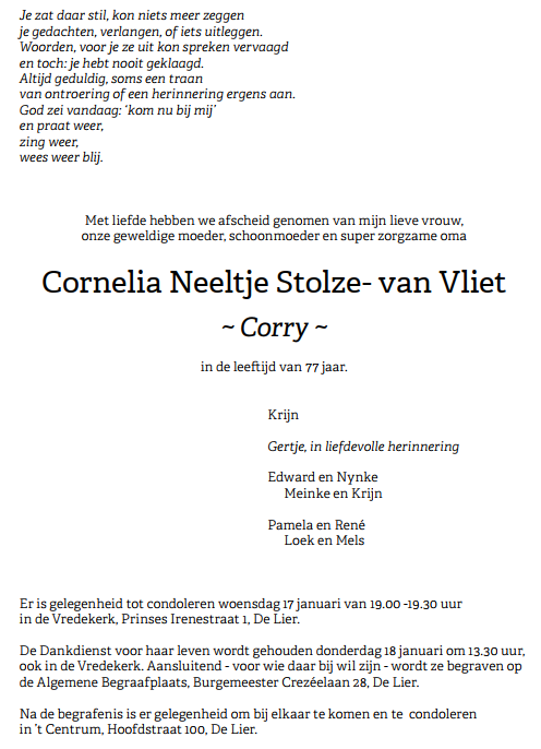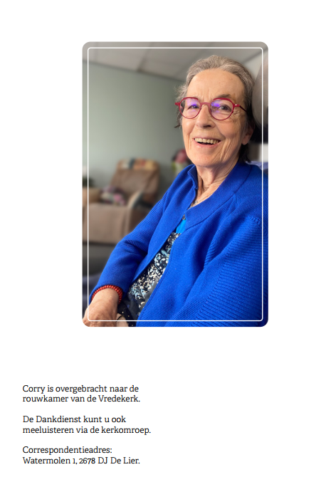 Donderdag 18 januari 2024 om 13.30 uurDankdienst Corry Stolze-van VlietVoorganger(s): ds. Lennart van Berkel Organist: Frank Baggerman Beamer: Cees Vermeer |
