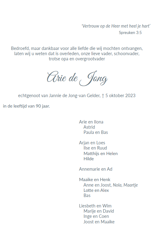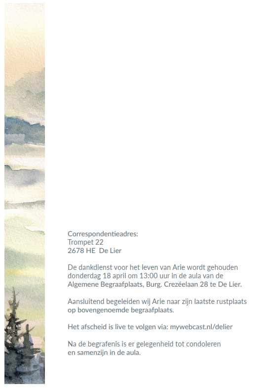 Donderdag 18 april 2024 om 13.00 uurDankdienst Arie de JongVoorganger(s): ds. Lennart van Berkel Locatie: Aula van de begraafplaats |