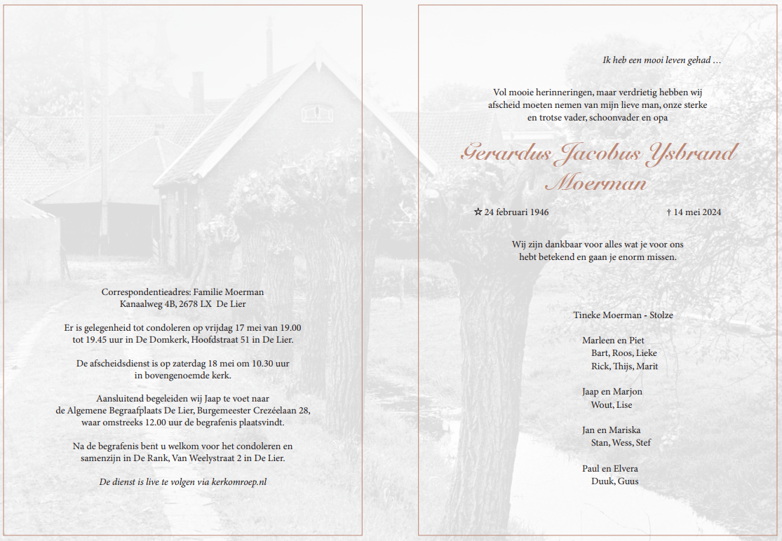 Zaterdag 18 mei 2024 om 10.30 uurAfscheidsdienst dhr. G.J.J. (Jaap) MoermanVoorganger(s): ds. Gerard van Velzen Organist: Jobje Versteeg-Zuur Beamer: Cees Vermeer |