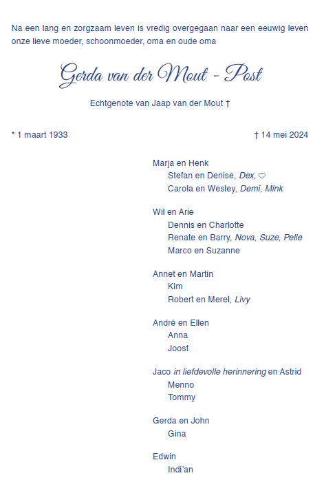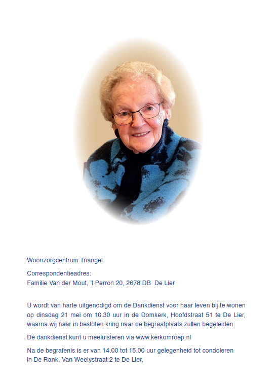 Dinsdag 21 mei 2024 om 10.30 uurDankdienst mw. Gerda van der Mout-PostVoorganger(s): Hans Paauwe Organist: Jobje Versteeg-Zuur Geluid: Ed Lijster |