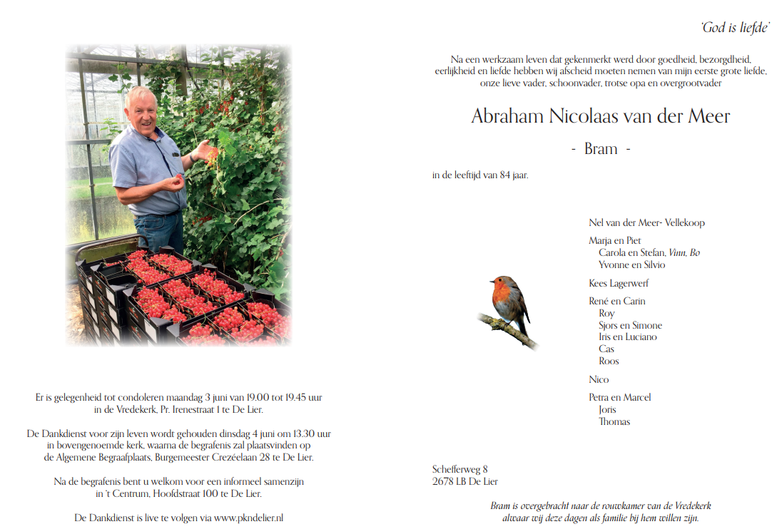 Dinsdag 4 juni 2024 om 13.30 uurDankdienst Bram van der MeerVoorganger(s): Gertjan Pellikaan Organist: Jobje Versteeg-Zuur Beamer: Cees Vermeer |