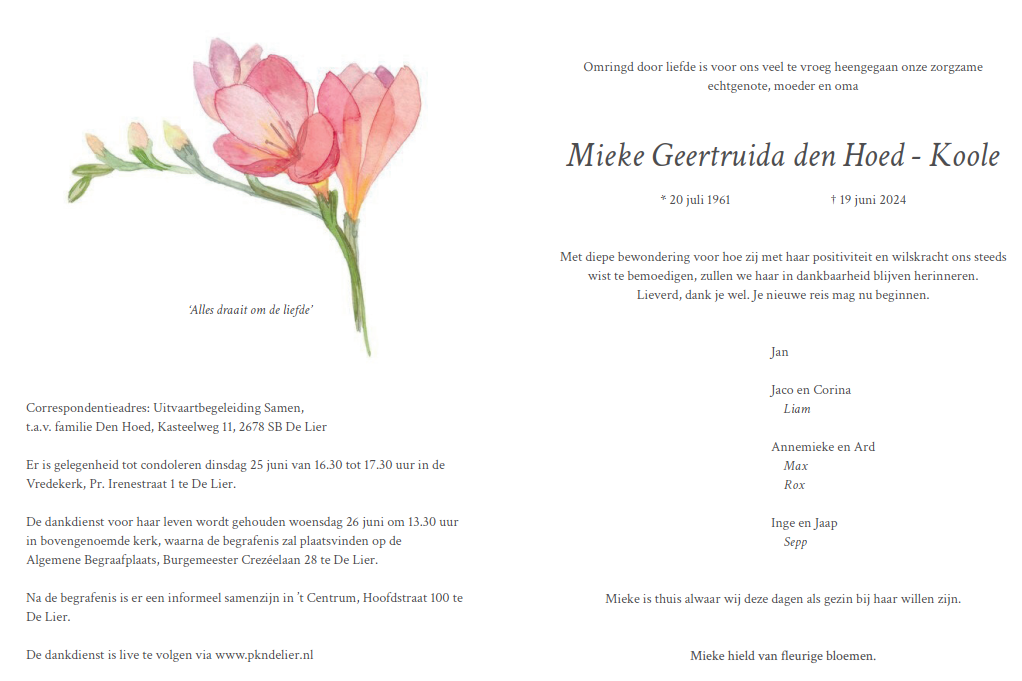 Woensdag 26 juni 2024 om 13.30 uurDankdienst Mieke den Hoed-KooleVoorganger(s): ds. Lennart van Berkel Ouderling(en): Rien van Dam Organist: Jobje Versteeg-Zuur Beamer: Paul Mosterd |