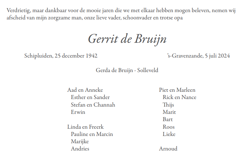 Vrijdag 12 juli 2024 om 10.30 uurDankdienst Gerrit de BruijnVoorganger(s): ds. Lennart van Berkel Ouderling(en): Siem van den Berg Organist: Jobje Versteeg-Zuur Beamer: Cees Vermeer |