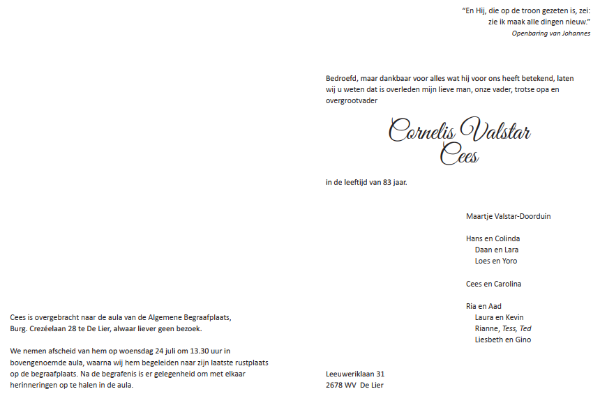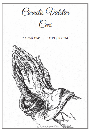 Woensdag 24 juli 2024 om 13.30 uurUitvaartplechtigheid Cees ValstarVoorganger(s): Gertjan Pellikaan Ouderling(en): Siem van den Berg