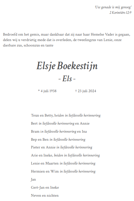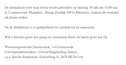 Dinsdag 30 juli 2024 om 13.00 uurDankdienst Els BoekestijnVoorganger(s): Hans Paauwe Organist: Frank Baggerman