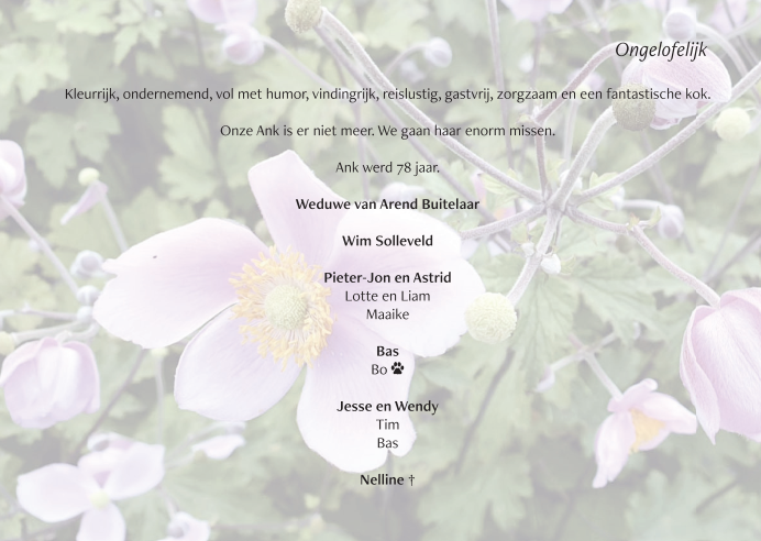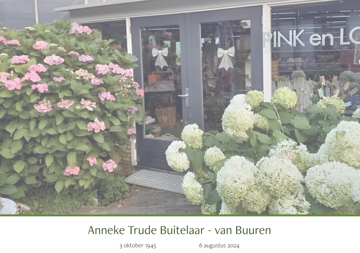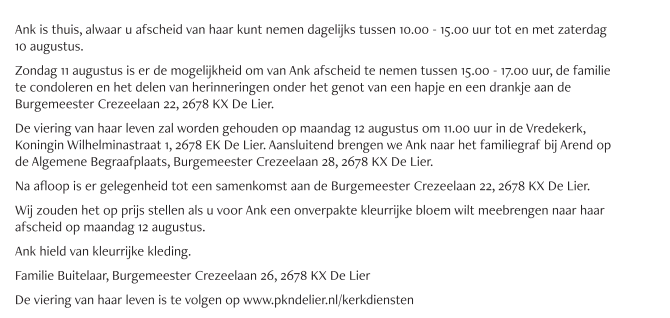 Maandag 12 augustus 2024 om 11.00 uurViering voor het leven van Ank Buitelaar-van BuurenVoorganger(s): Hans Paauwe Tekst(en): 1 Johannes 4: 8b Ouderling(en): Suzan van Zanten-Keijzer Organist: Jobje Versteeg-Zuur Beamer: Paul Mosterd |