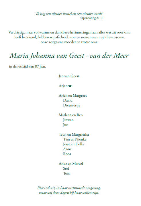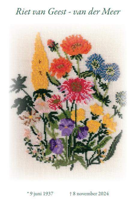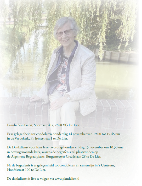 Vrijdag 15 november 2024 om 10.30 uurDankdienst Riet van Geest-van der MeerVoorganger(s): Hans Paauwe Organist: Frank Baggerman Beamer: Cees Vermeer |