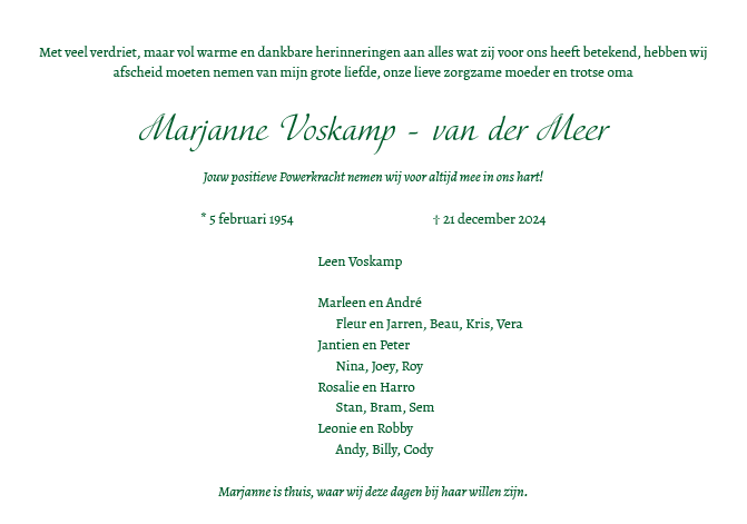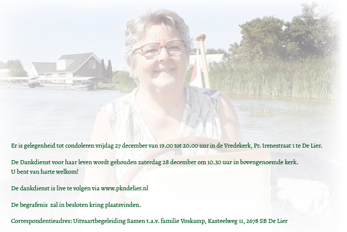 Zaterdag 28 december 2024 om 10.30 uurDankdienst Marjanne Voskamp-van der MeerVoorganger(s): Gertjan Pellikaan Ouderling(en): Arjen van Duijn Organist: Jobje Versteeg-Zuur Beamer: Cees Vermeer |