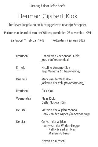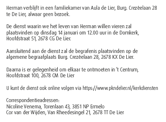 Dinsdag 14 januari 2025 om 12.00 uurDankdienst Herman Gijsbert KlokVoorganger(s): ds. Ad de Bruijne Beamer: Cees Vermeer |