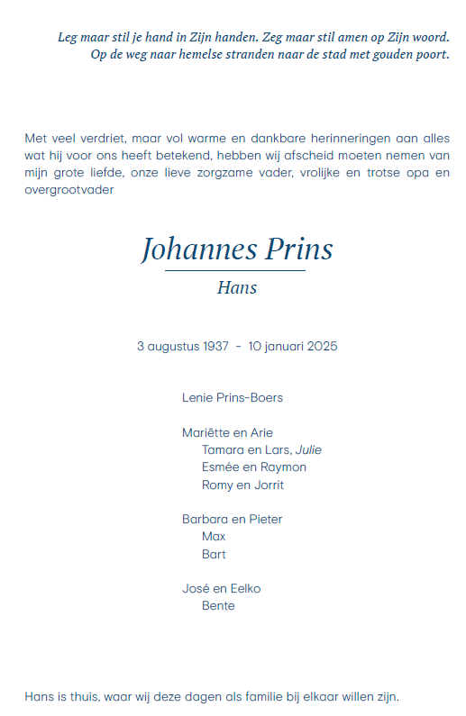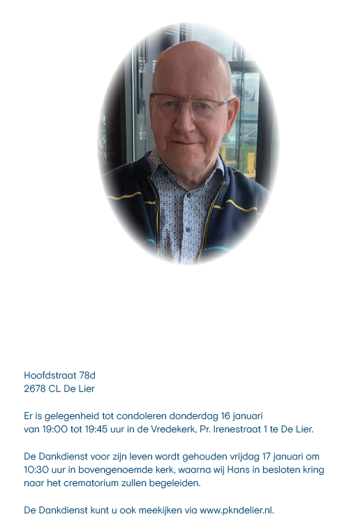 Vrijdag 17 januari 2025 om 10.30 uurDankdienst Hans PrinsVoorganger(s): Hans Paauwe Organist: Leo Bouma Beamer: Koos de Rijkje |