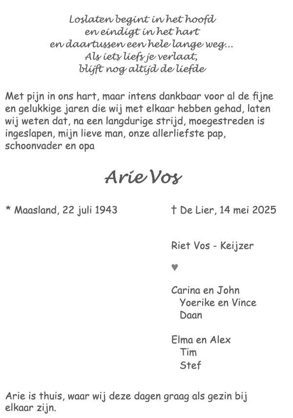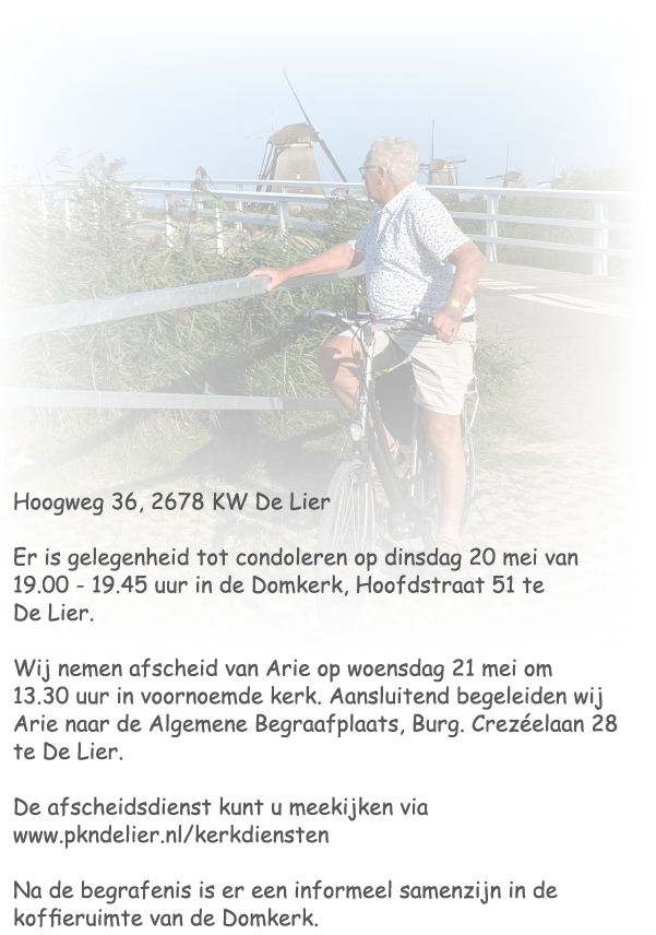 Woensdag 21 mei 2025 om 13.30 uurAfscheidsdienst Arie VosVoorganger(s): Gertjan Pellikaan Beamer: Paul Mosterd |