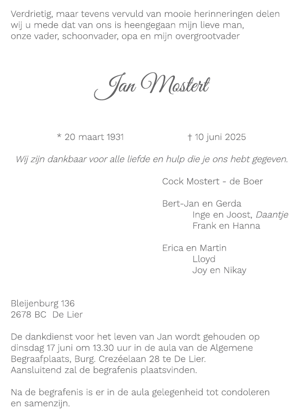 Dinsdag 17 juni 2025 om 13.30 uurDankdienst Jan MostertVoorganger(s): Hans Paauwe Locatie: Aula van de algemene begraafplaats |