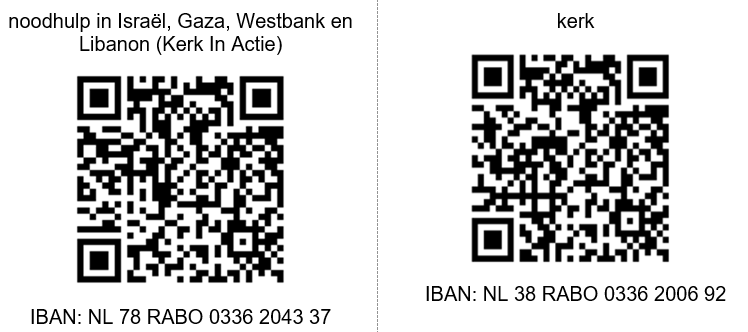 Vandaag wil de diaconie de eerste collecte gebruiken voor de noodhulp in Israël, Gaza, Westbank en Libanon (Kerk In Actie). Nu de feestweek in De Lier weer is afgesloten welke we in vrijheid en met volop eten en drinken en indien nodig medische zorg mochten meemaken richten we ons weer op de nood in de wereld. Temidden van conflict en wanhoop in het Midden-Oosten biedt Kerk in Actie hulp aan mensen in nood, waaronder medische hulp, voedsel en onderdak. Ook werken ze aan dialoog en vredesopbouw. Dit doen ze samen met kerken ter plaatse. Leef mee en geef nu!