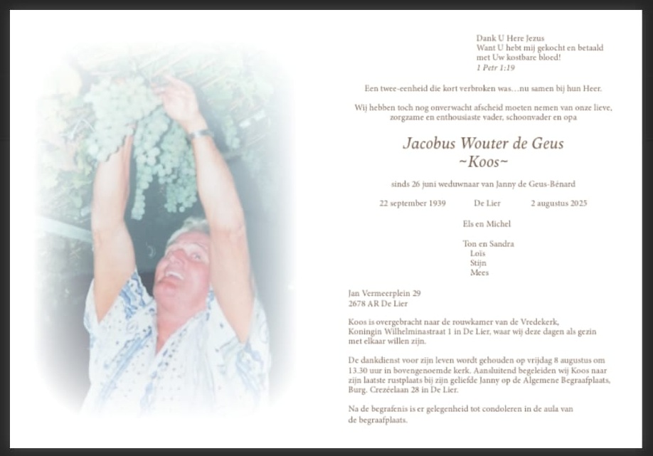 In de nacht van vrijdag op zaterdag, is op 2 augustus overleden Koos de Geus, in de leeftijd van 85 jaar. Het is pas 5 weken geleden dat zijn vrouw Janny overleed. De afscheidsdienst is op vrijdag 8 augustus om half 2 in de Vredekerk. Na de ter aarde bestellling is er gelegenheid de familie te condoleren in de aula van de Lierse begraafplaats. We leven mee met Els & Michel, Ton & Sandra en hun kinderen en verdere familie, en iedereen die hem liefhad. We bidden voor hen om Gods liefdevolle en troostende nabijheid in deze moeilijke tijd.